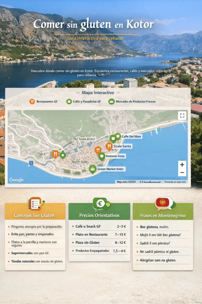 Visitar Kotor es toda una experiencia.Kotor es una ciudad pequeña pero con un turismo creciente, lo que ha llevado a muchos restaurantes y cafés a adaptarse a dietas especiales, incluyendo opciones sin gluten. La cocina montenegrina tradicional suele usar pan, pastas y empanados, pero hoy encontrarás alternativas seguras si planificas bien tus comidas.