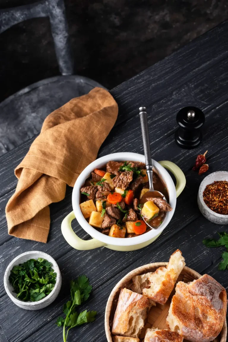 Estofado de carne con cebolla, pimentón, pimienta y especias.